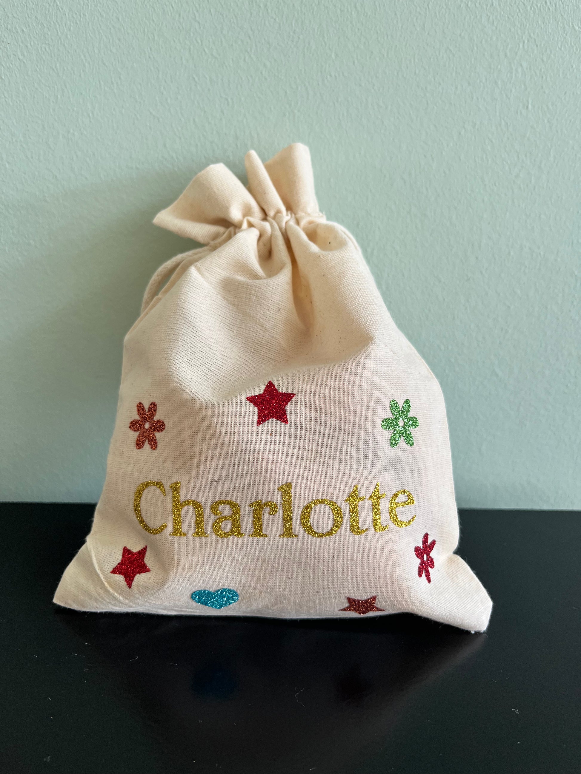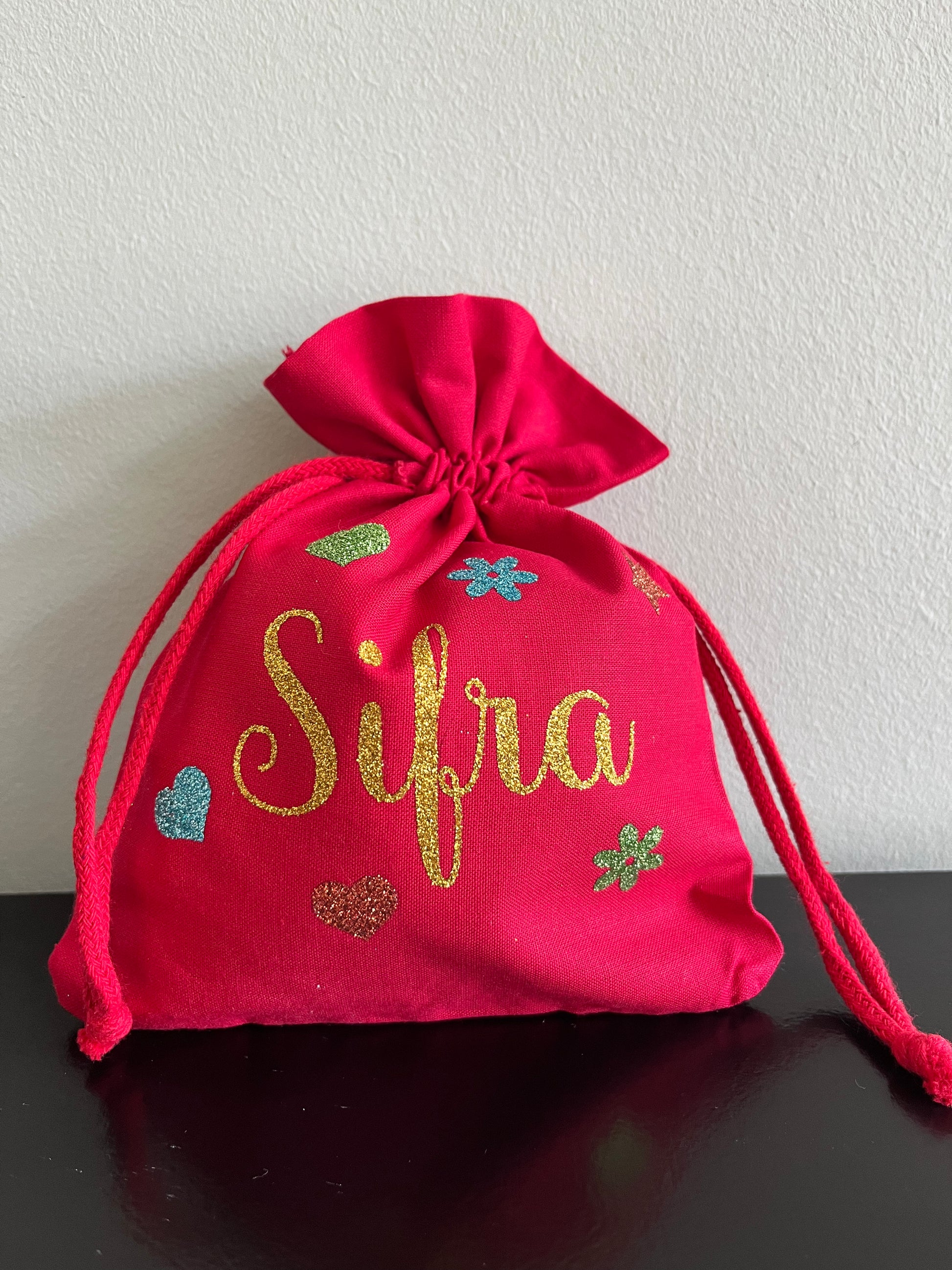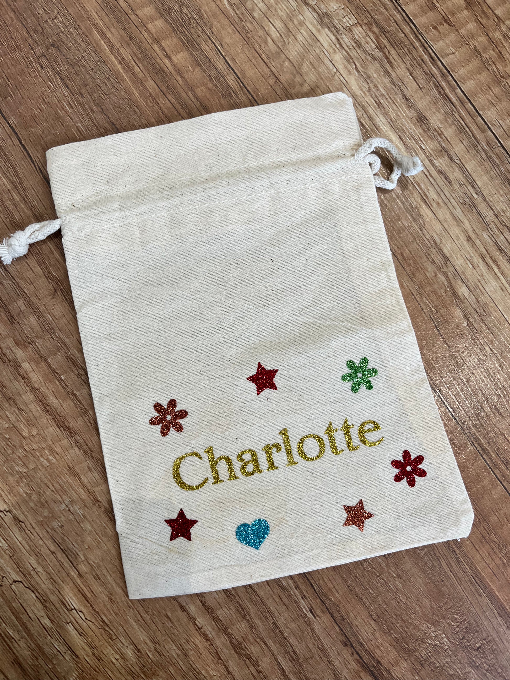 Katoenen zakjes met treksluiting, ongeveer 12x15cm. Wordt standaard bedrukt zoals afgebeeld. Kan bedrukt worden met een naam of andere tekst. Geef uw wensen door in het vakje ‘opmerkingen’.