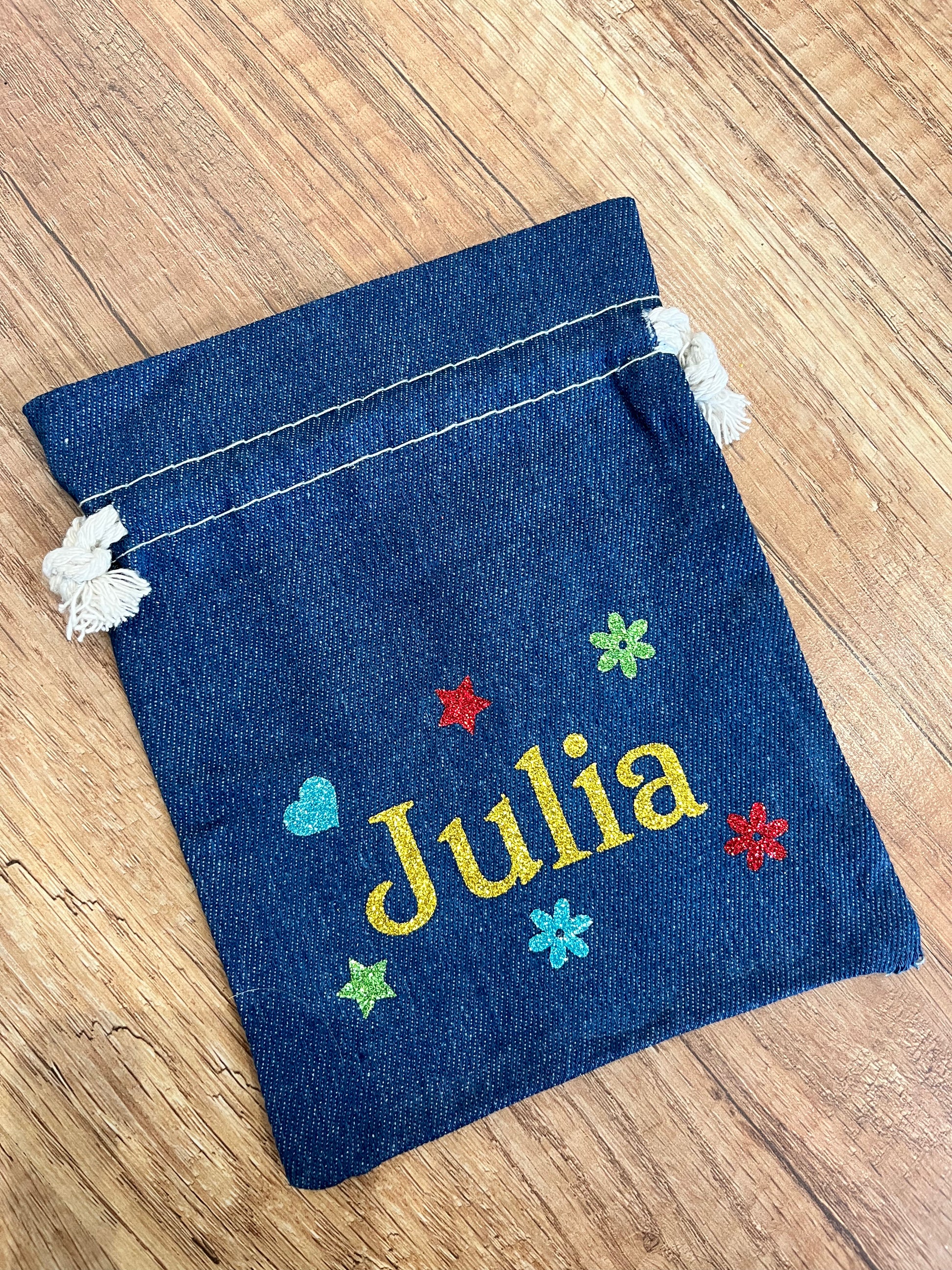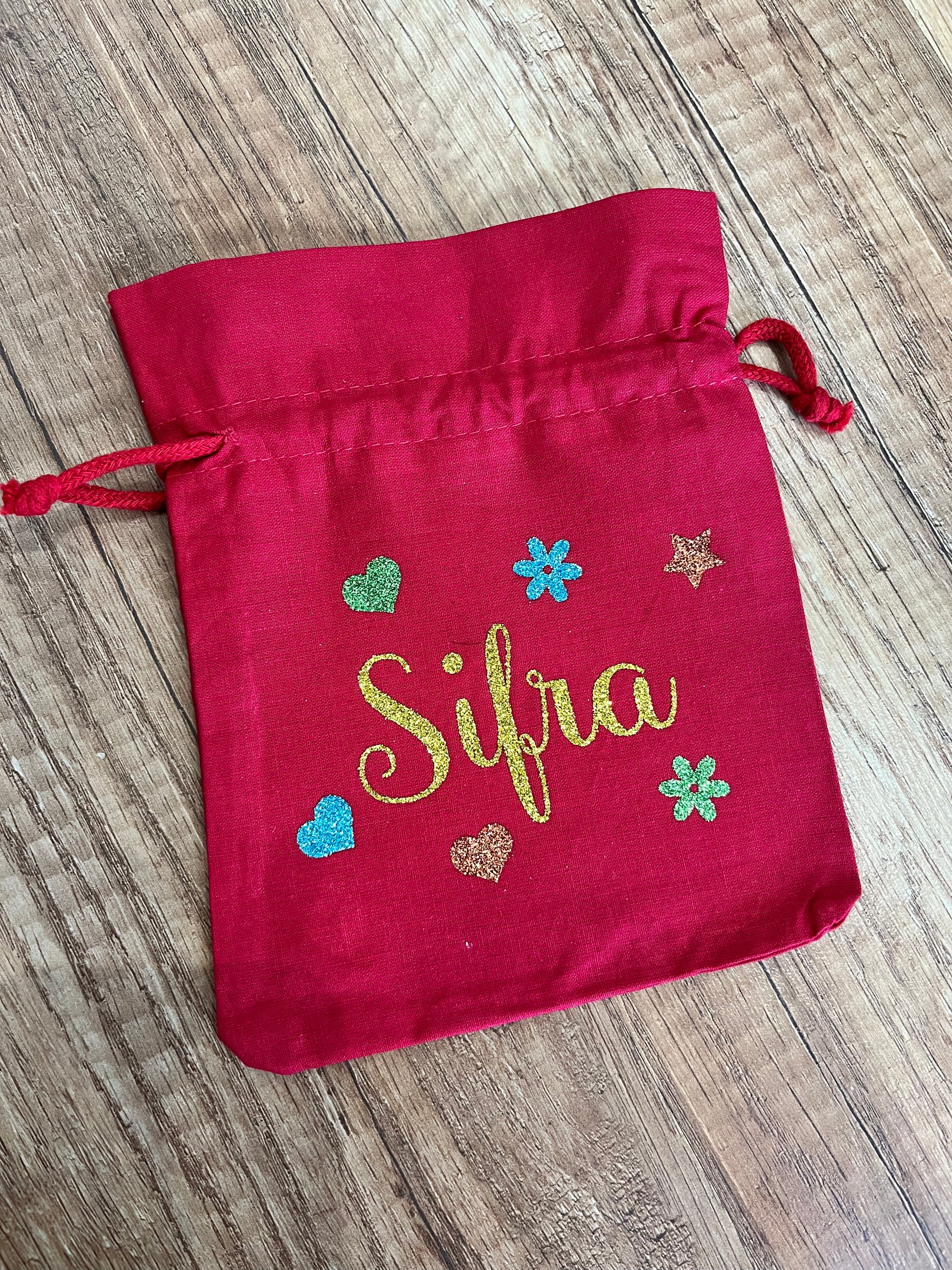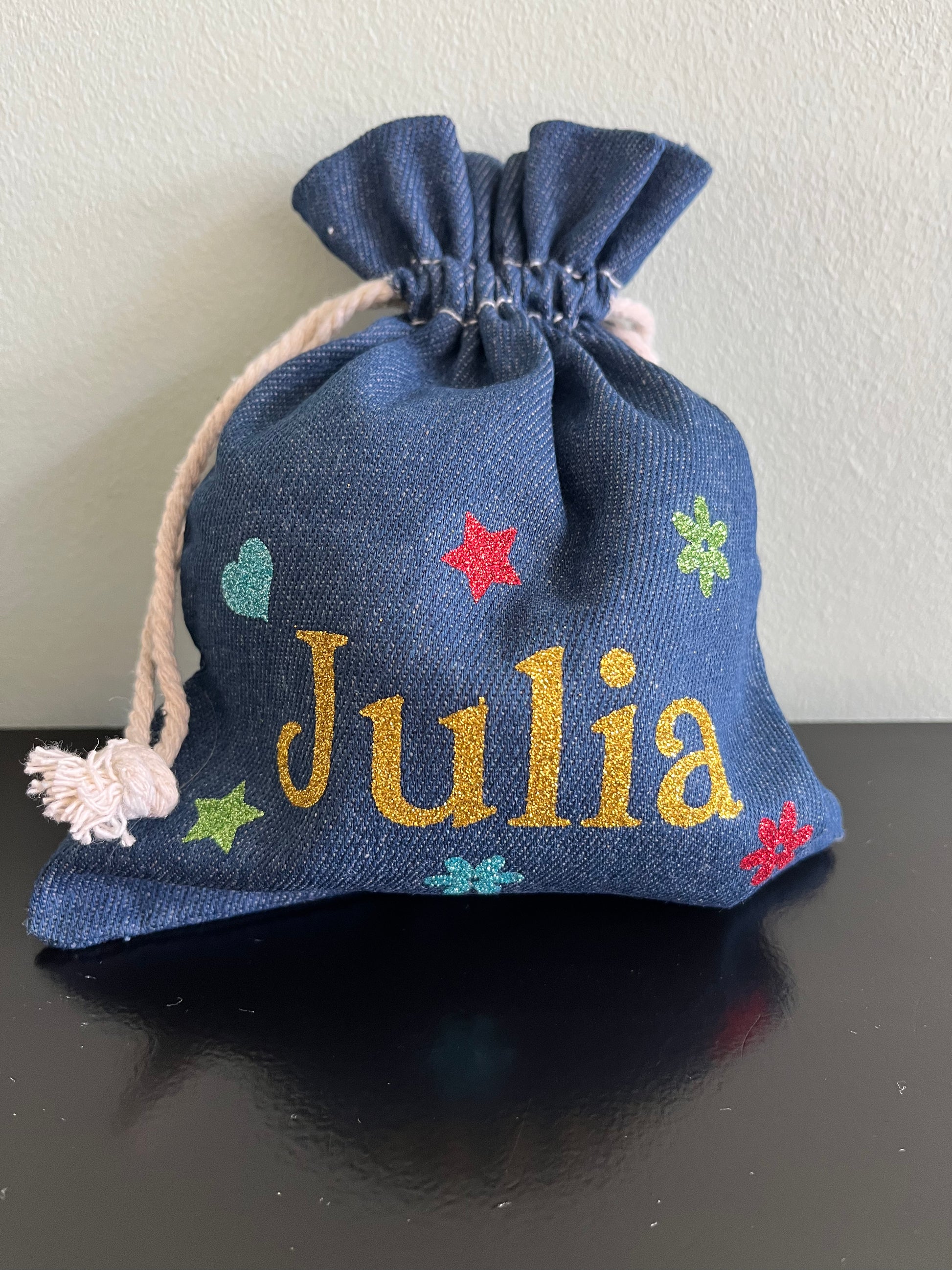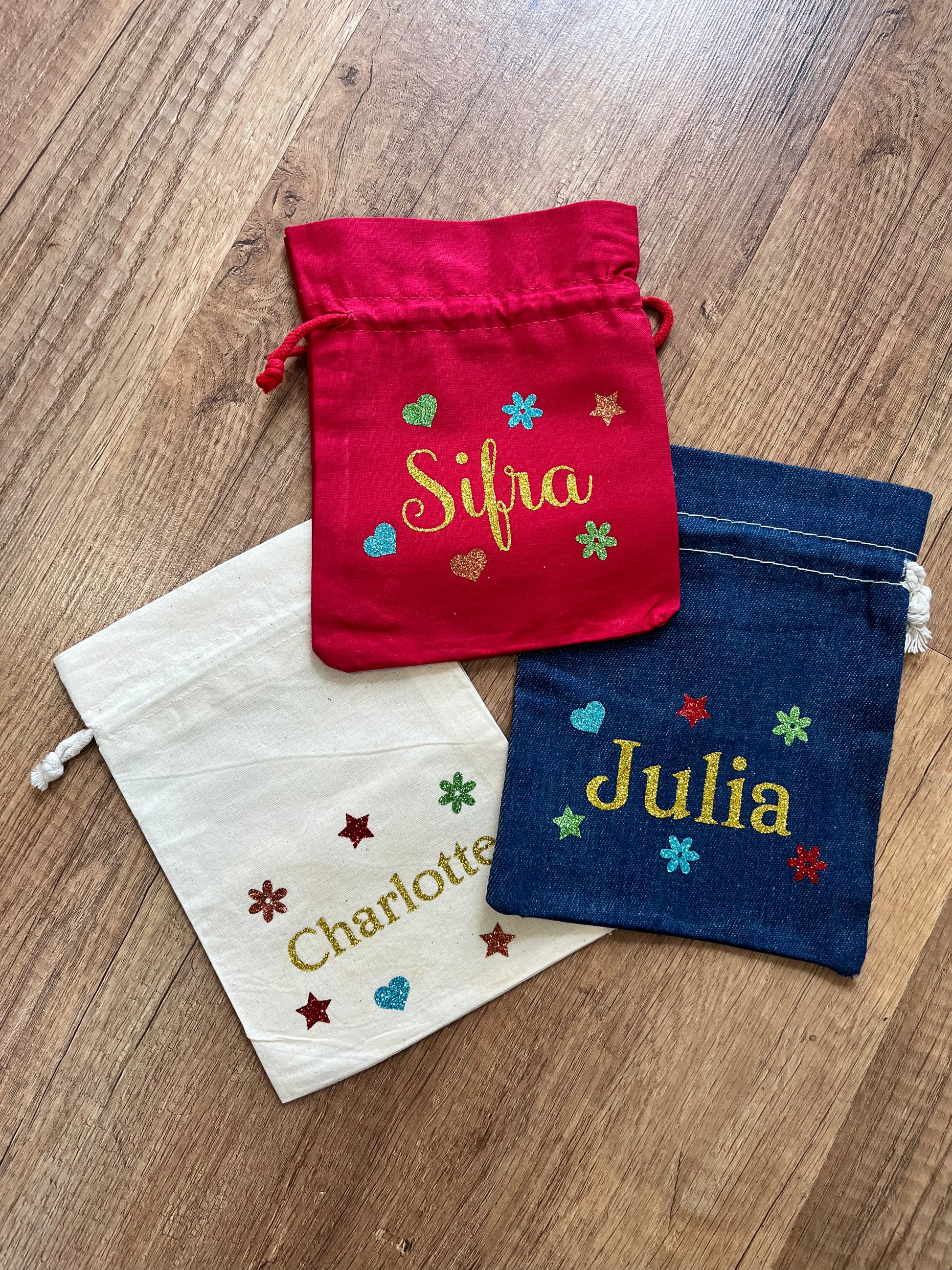 Katoenen zakjes met treksluiting, ongeveer 12x15cm. Wordt standaard bedrukt zoals afgebeeld. Kan bedrukt worden met een naam of andere tekst. Geef uw wensen door in het vakje ‘opmerkingen’.
